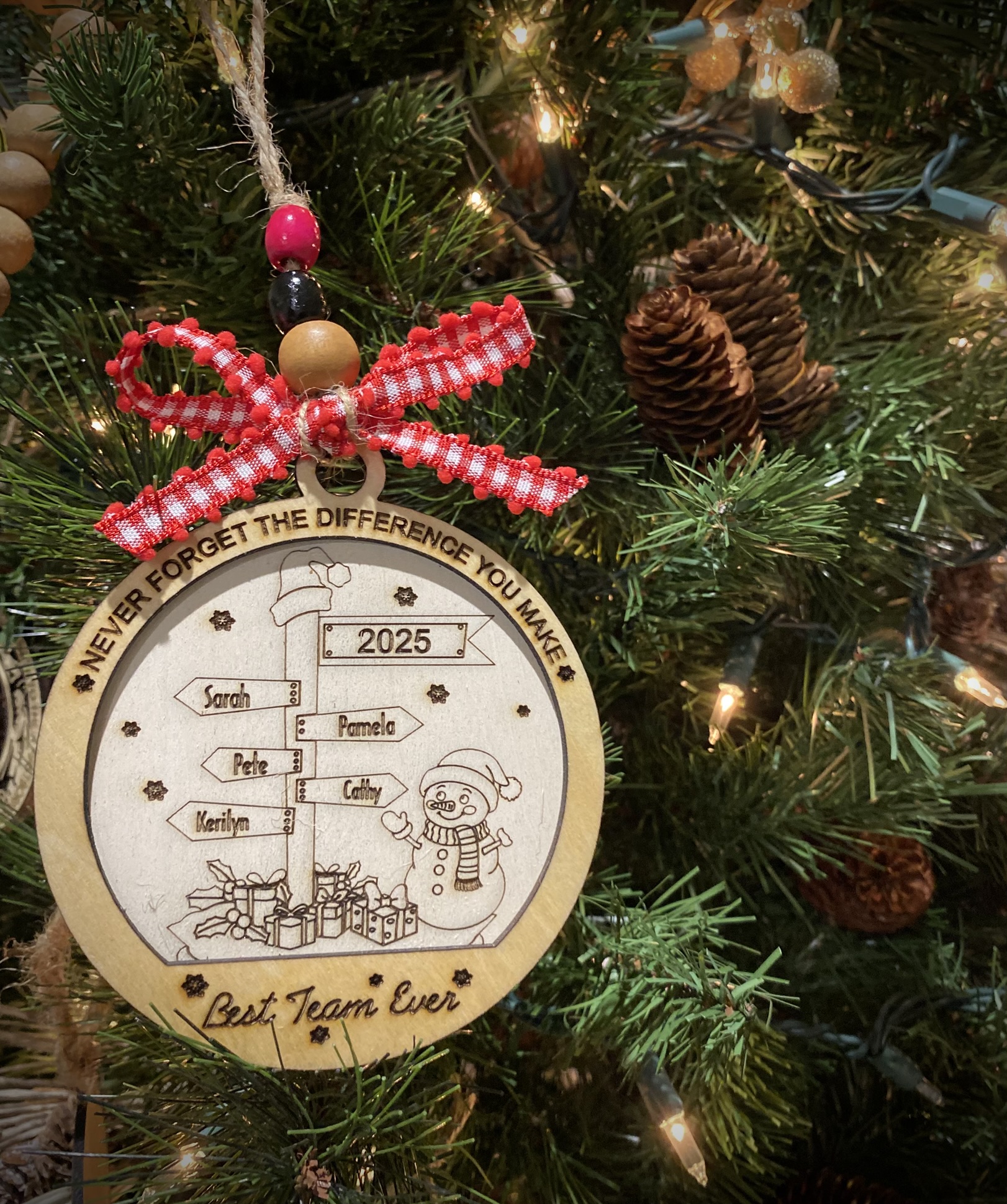 Crafted from premium wood and detailed with precision engraving, each ornament features custom team member names, year, and an encouraging message that recognizes dedication and impact. The cheerful snowman and gift-laden signpost add a touch of seasonal joy to any tree or office display.
